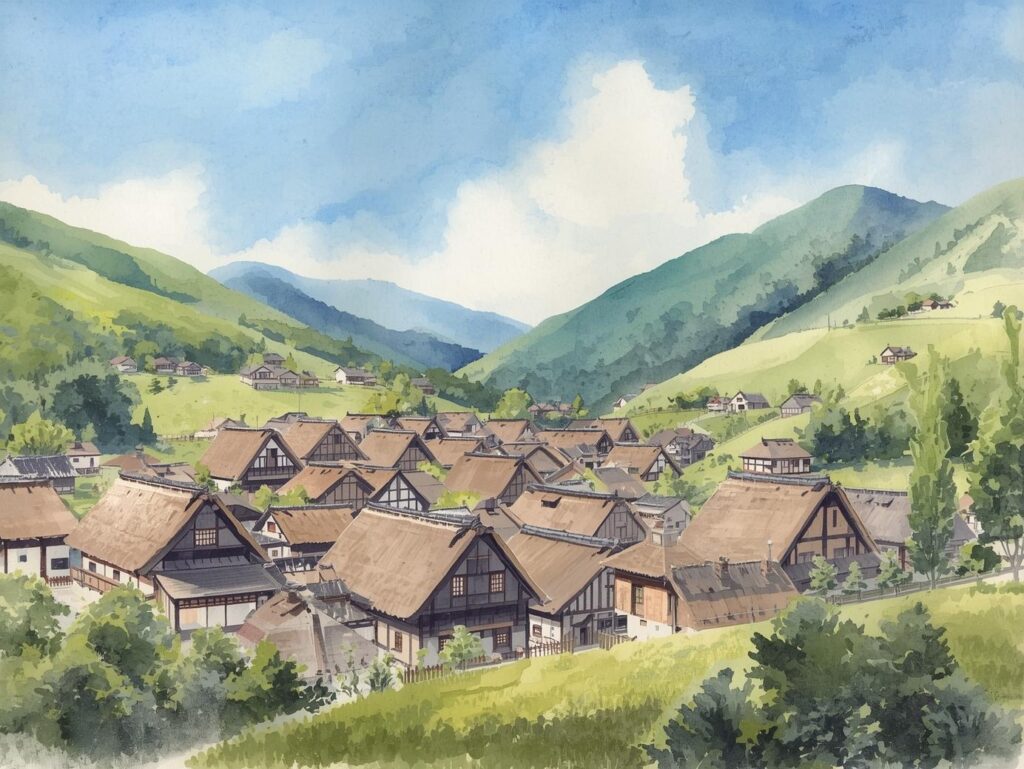 その匂いに、なぜか懐かしさがこみ上げた。展望台へ続く道を登ると、眼下には合掌屋根が点々と並ぶ村の全景が広がる。