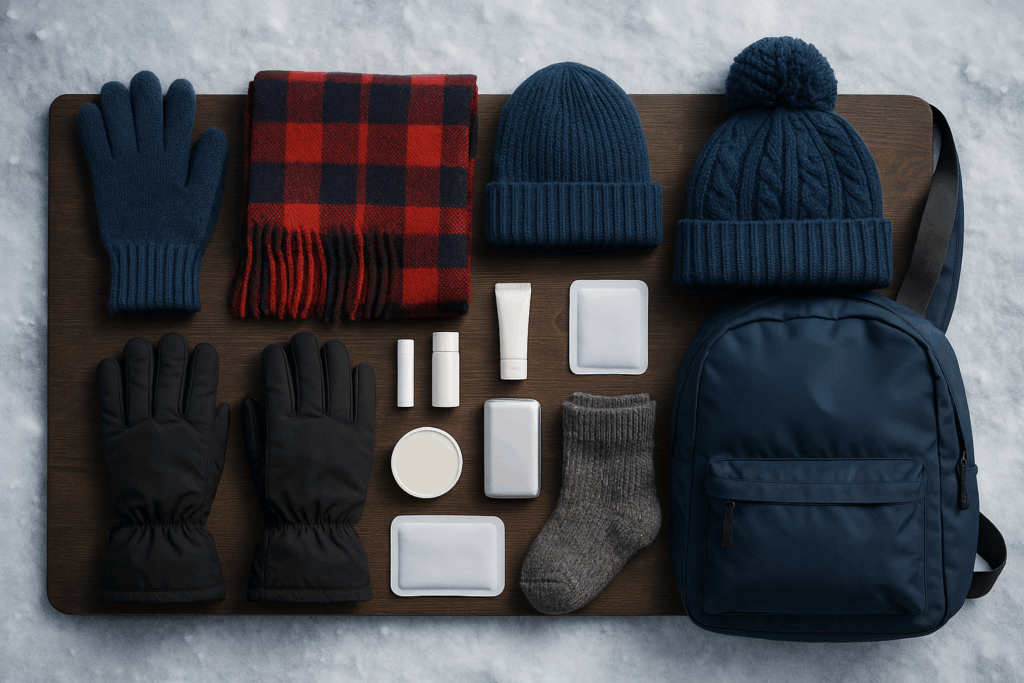 手袋、マフラー(またはネックウォーマー)、スノーブーツ、カイロ、保湿アイテム、モバイルバッテリー。