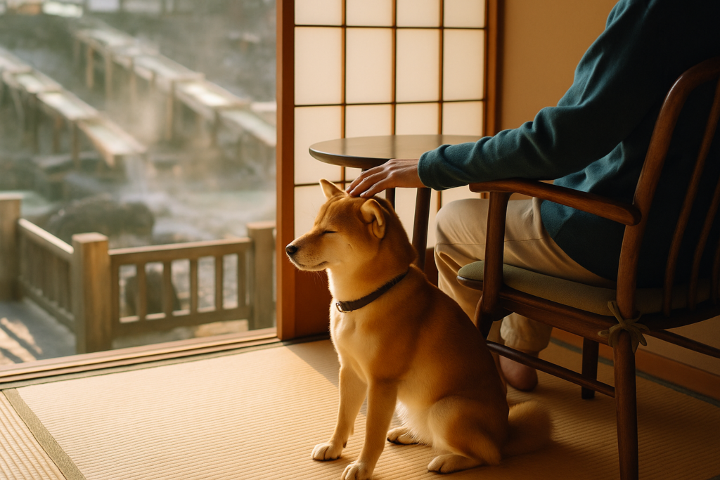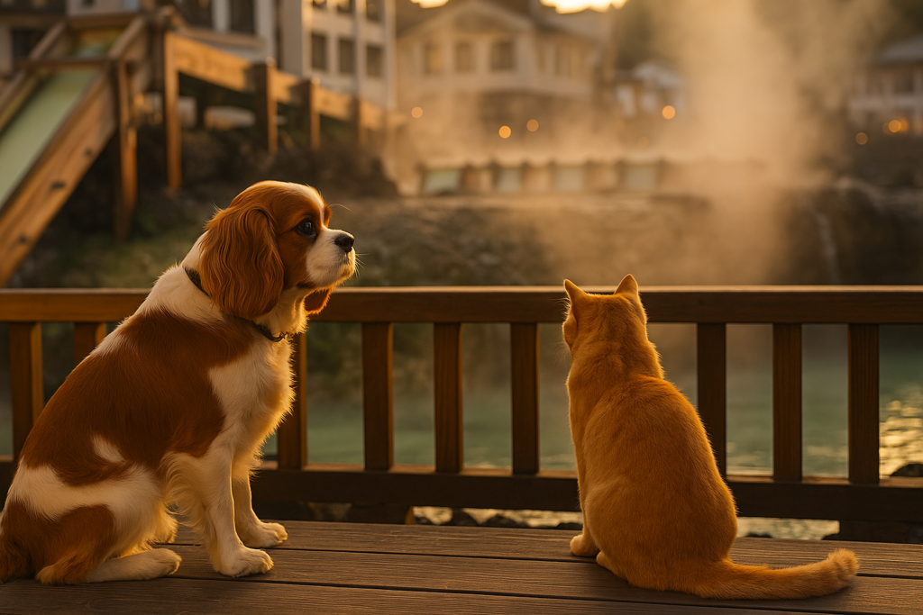 湯けむりに包まれた夜、ペットが満足そうに丸くなって眠る姿を見つめながら、