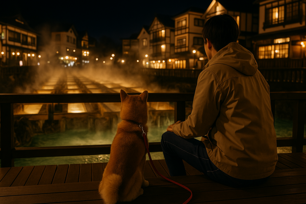 湯畑の光に浮かぶ石畳の上で、愛犬の足音がコツ、コツと響く。