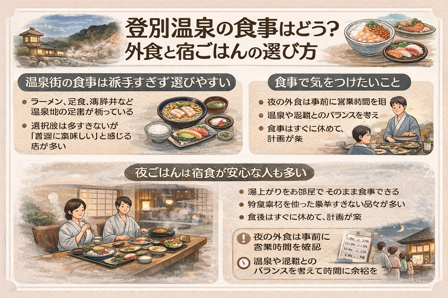 ただ、温泉地としては食事の選択肢が比較的そろっていて、初心者でも困りにくい印象でした。