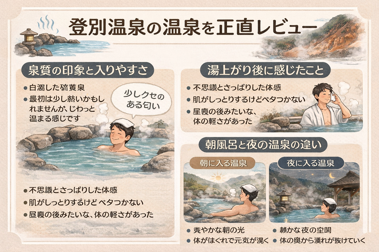 温泉によっては入浴後に少し重だるく感じることもありますが、登別温泉では比較的すっきりした印象が残りました。