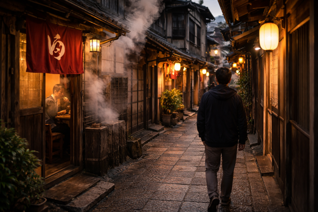 宿の温泉で身体を温め、少し街へ出て、生活の音に触れ、また宿に戻って湯に浸かる。
