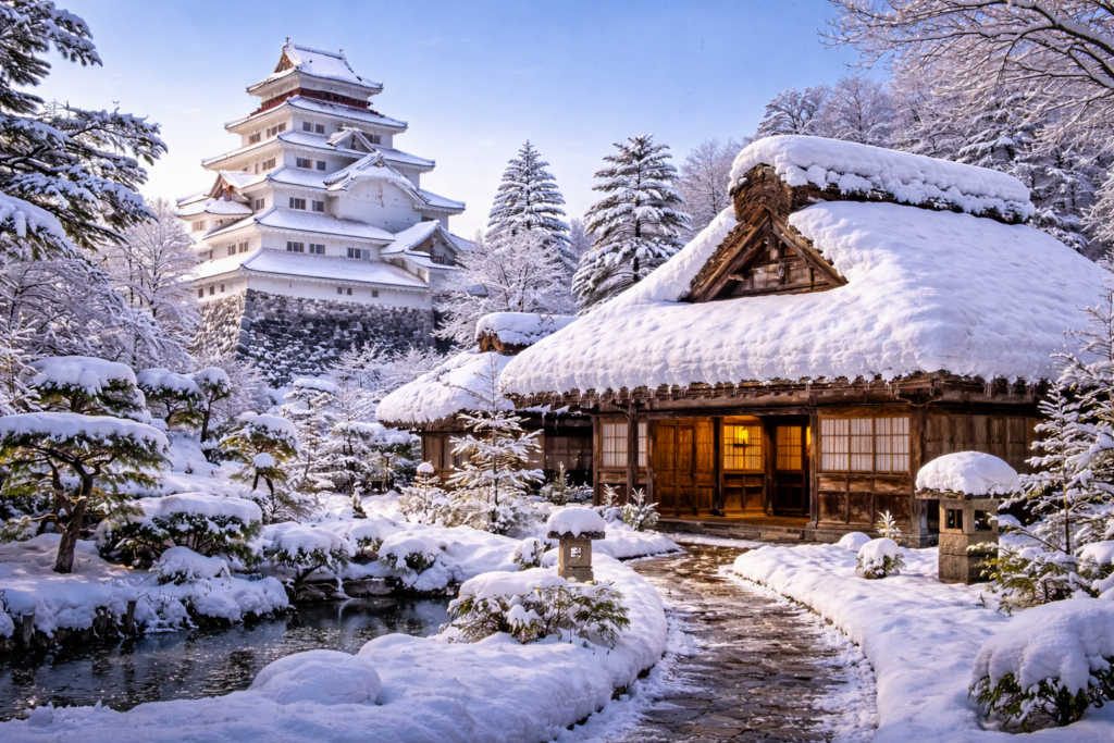 一面の白銀が茅葺き屋根をやさしく包み込み、空気は澄みきり、吐く息が白く立ち上る。
