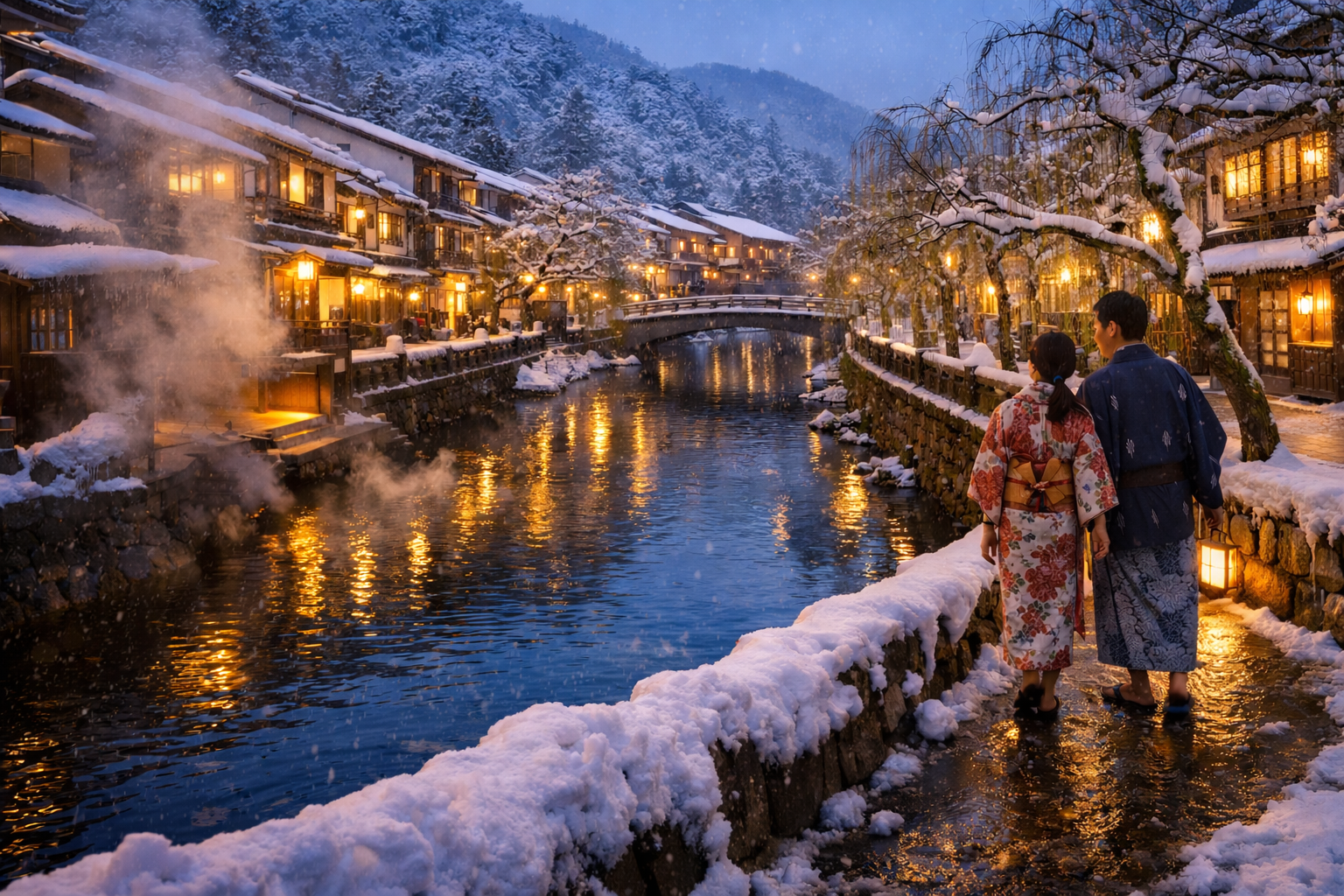 雪がしんしんと降る夜、柳並木が白く染まり、川面に湯けむりが立ちのぼる景色は息をのむほど美しい。