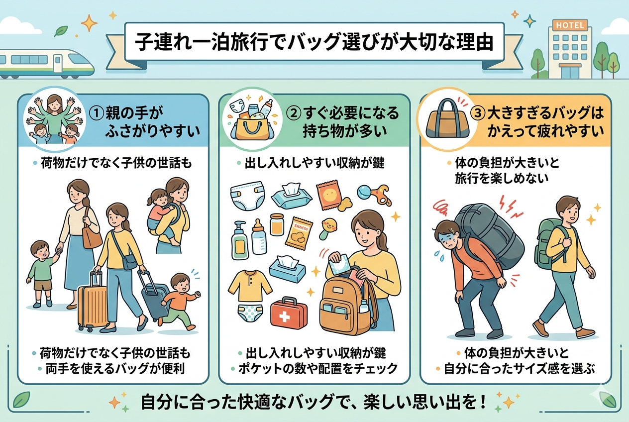 この記事では、子連れ一泊旅行に向くバッグの選び方を、初心者にもわかりやすく解説します。