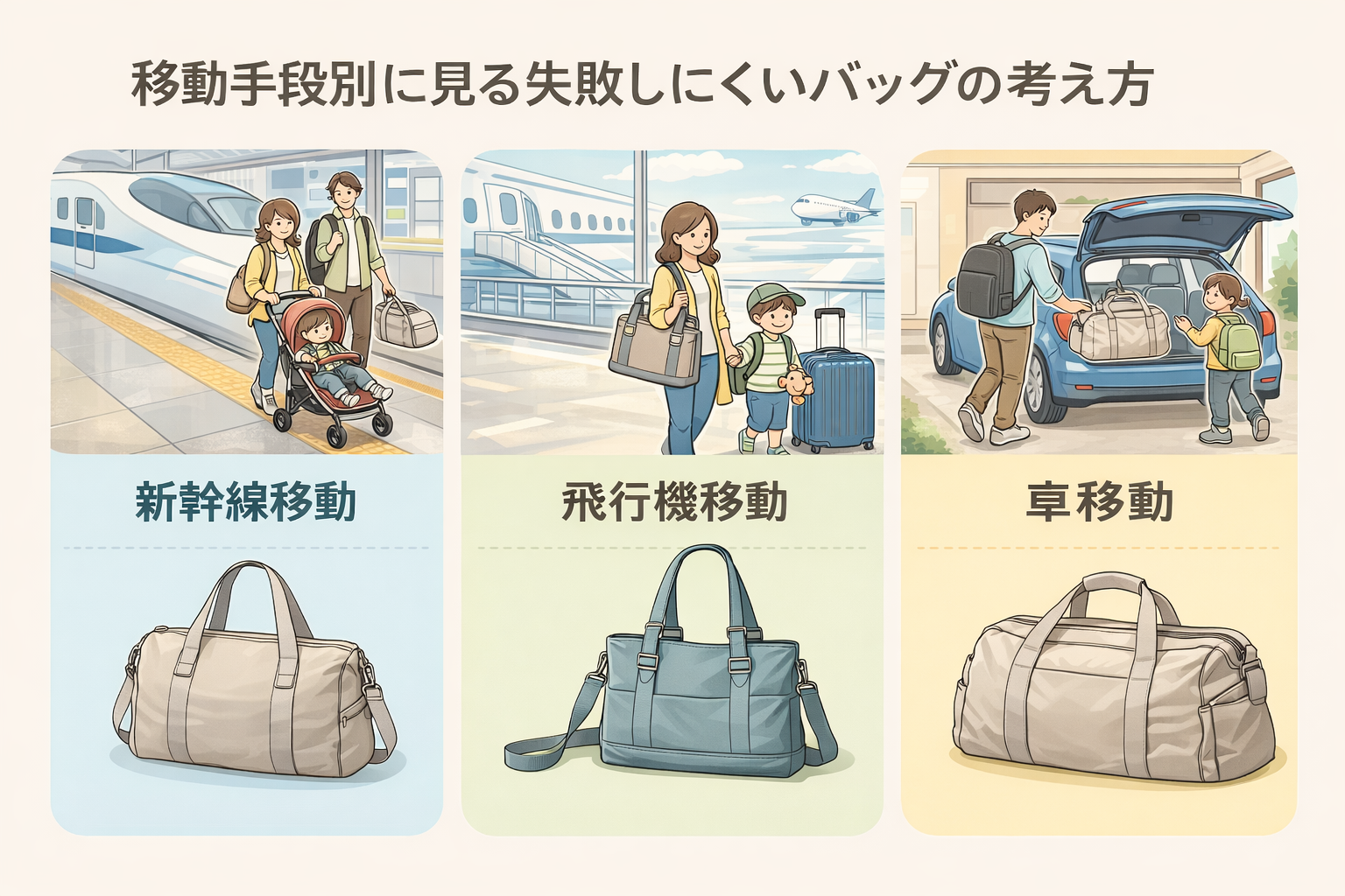 同じ一泊旅行でも、移動手段が違うと使いやすいバッグも変わります。