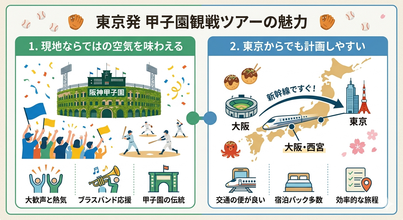 東京発で甲子園へ行く観戦プランは、一度は現地の雰囲気を味わいたい方や、高校野球の熱気を体感してみたい方に向いています。テレビでは伝わりにくい応援の迫力や球場の空気感を、実際にその場で感じられるのは大きな魅力です。