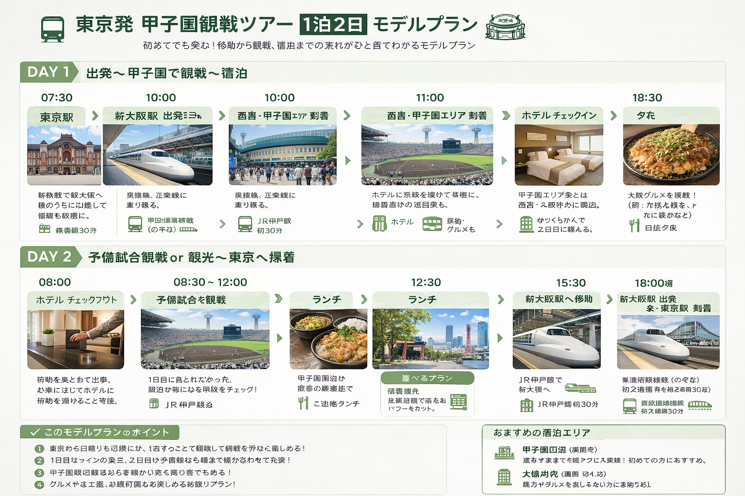 東京発で甲子園へ高校野球を見に行くなら、初めての方は無理のない1泊2日のモデルプランを意識すると安心です。移動と観戦の両方に余裕を持たせることで、現地の雰囲気までしっかり楽しみやすくなります。