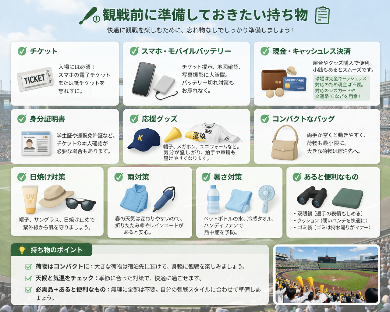 甲子園観戦では、忘れ物が少ないだけでも安心感が大きく変わります。基本的には、チケットや予約情報を確認できるもの、スマートフォン、財布、飲み物、タオルなどは早めに準備しておきたいところです。