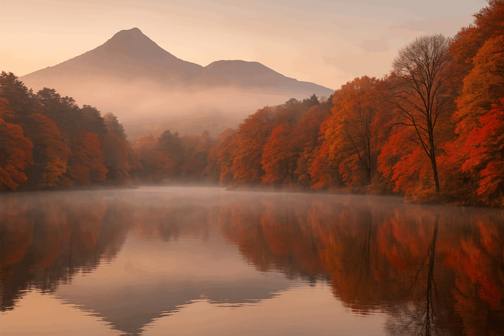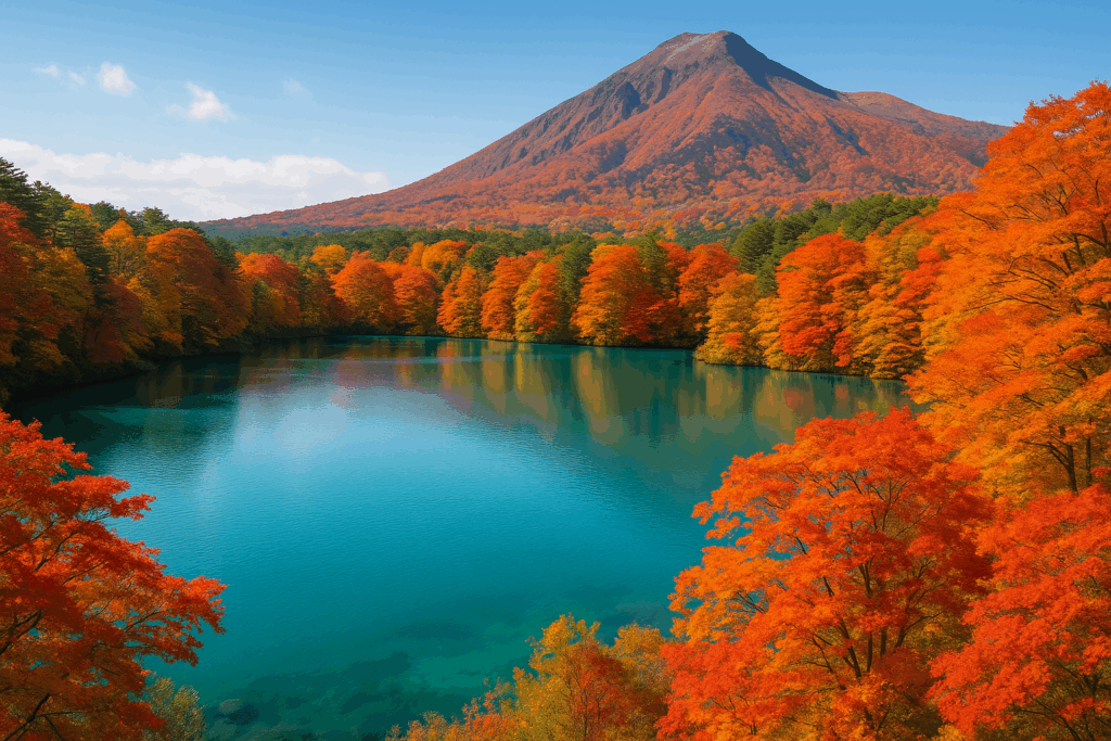 裏磐梯や五色沼では、湖面に紅葉が映る“鏡紅葉”が旅人を迎える。