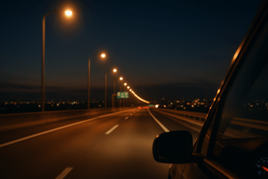 高速道路のランプが流れていく光景に、心が少しずつ解けていく。