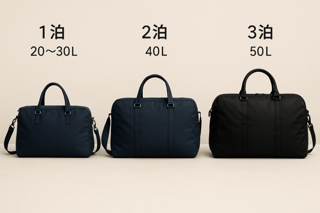 | 2泊 | 35〜45L | ボストン/2WAYトート/リュック | 衣類+ガジェットが入る中容量。電車・車旅に最適。 |
