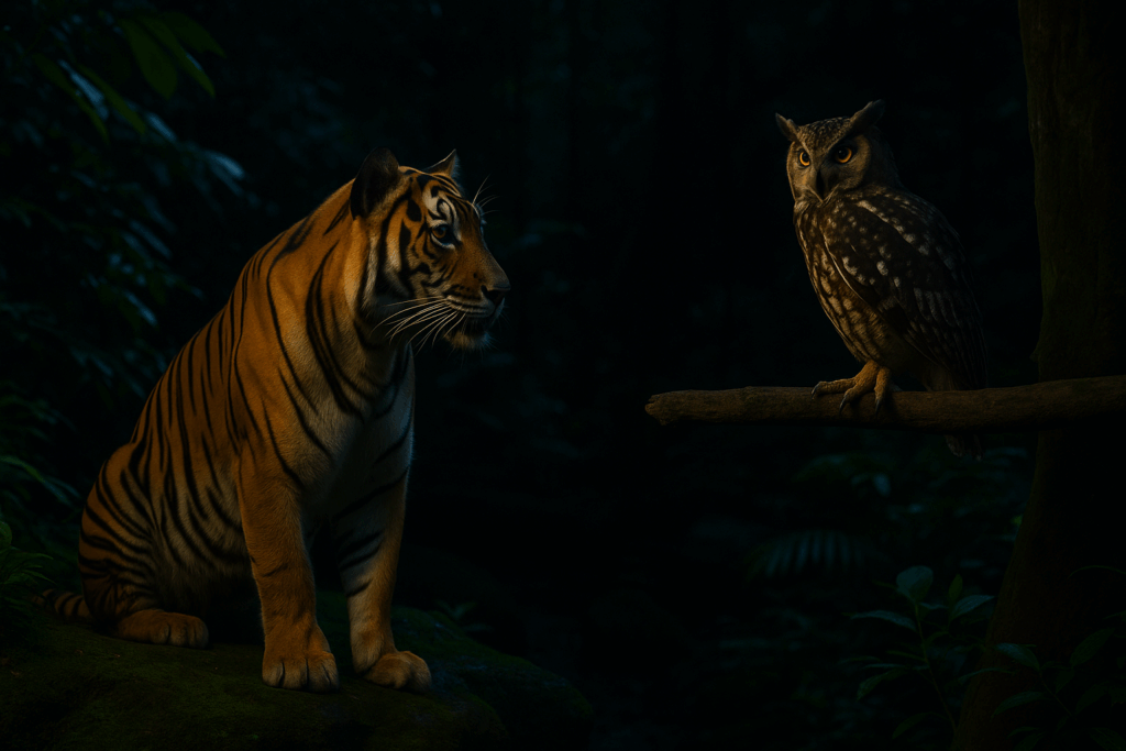 夜のナイトサファリでは、闇の中からトラの瞳が静かに光る。