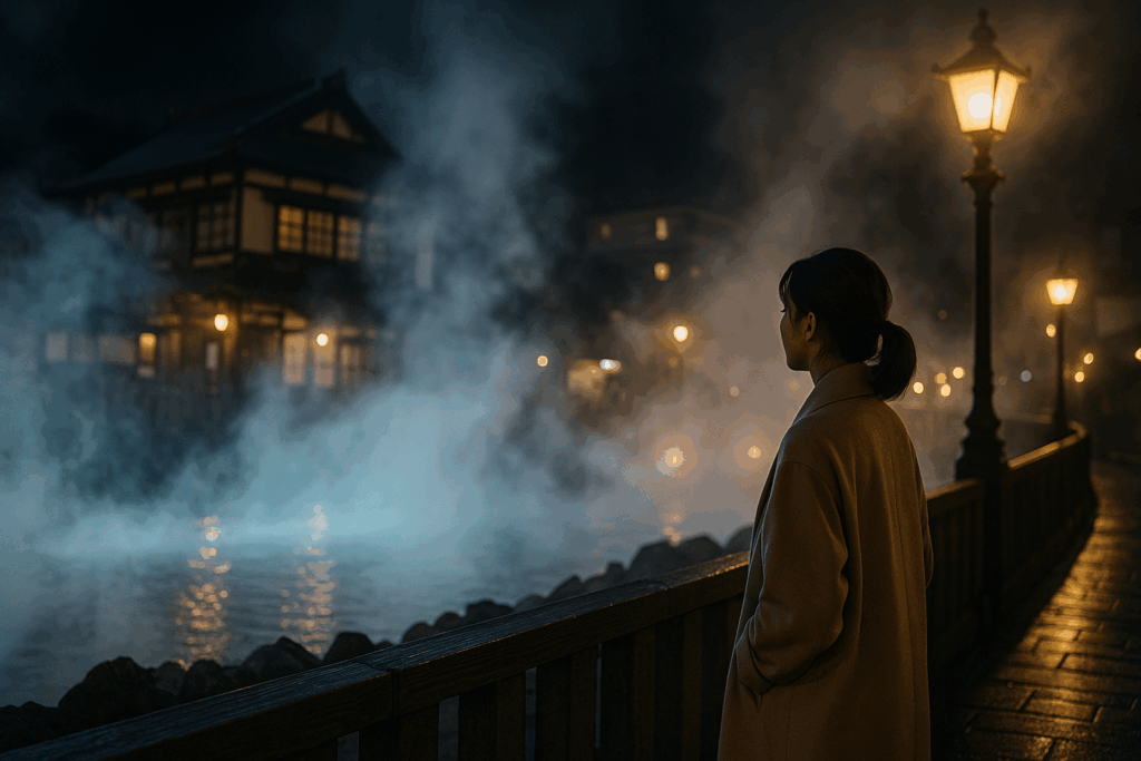 湯けむりが夜の闇と溶け合い、街全体がひとつの大きな夢のように揺れている。