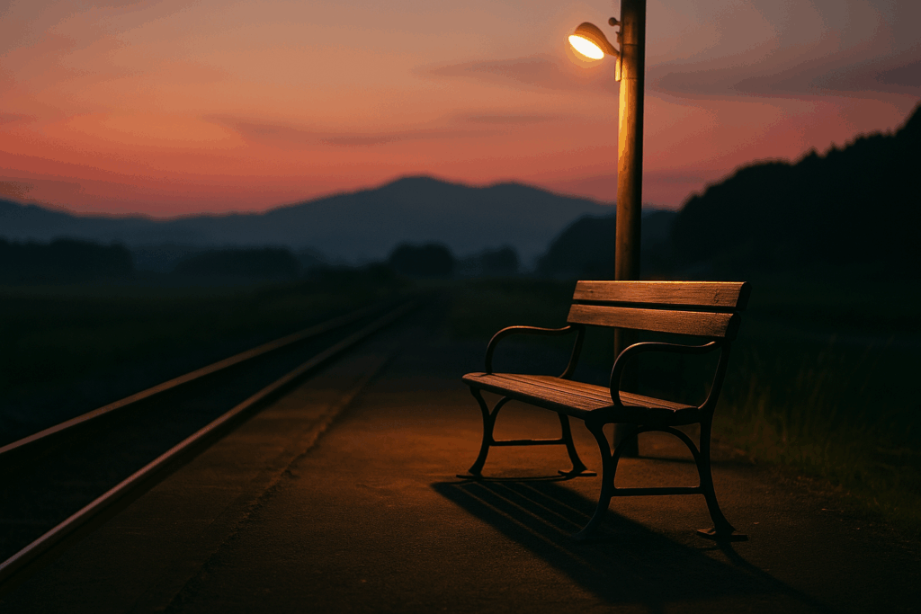 静寂に包まれたホーム、頬を撫でる風の匂い、夕陽に伸びるベンチの影——